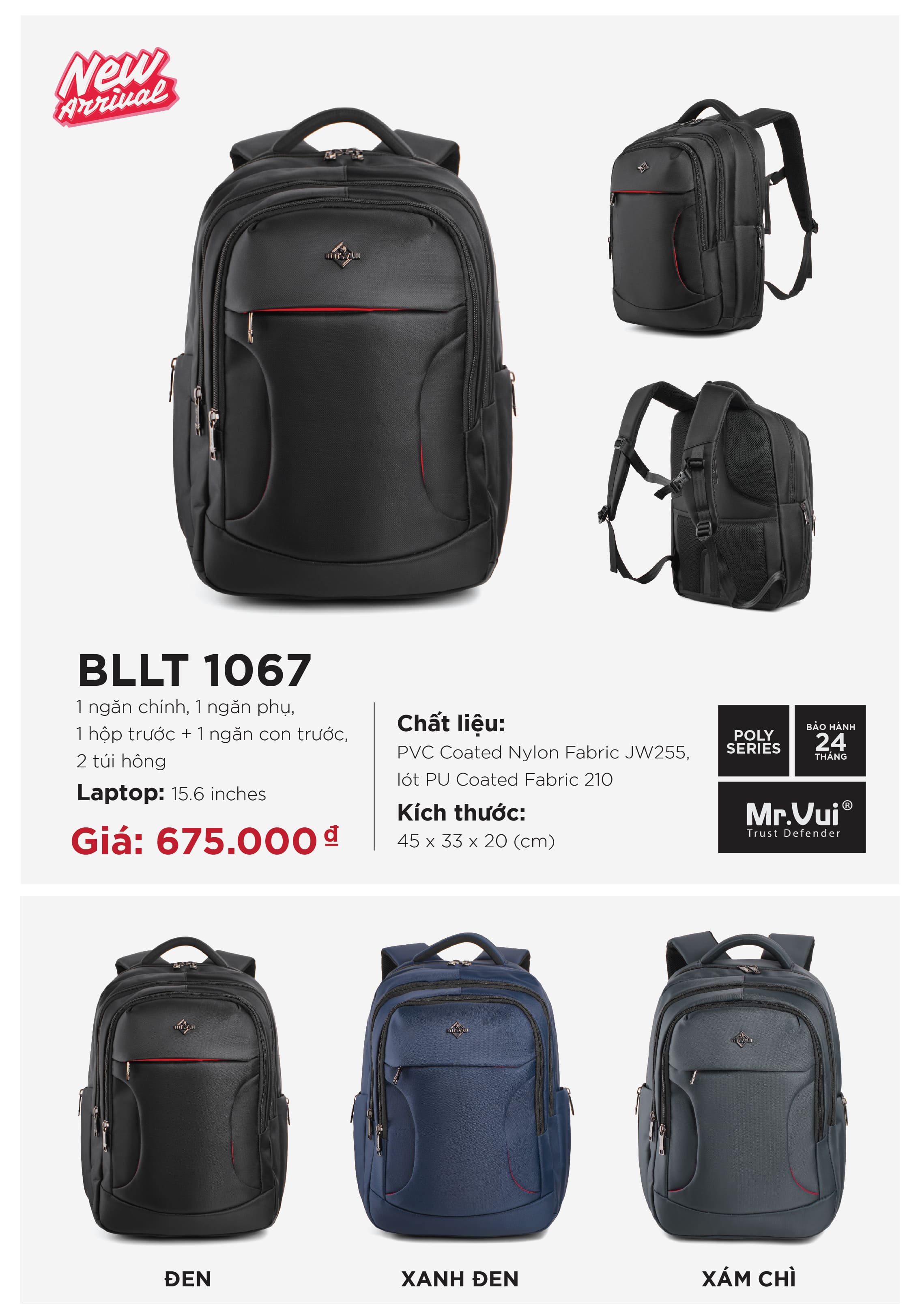 Balo Laptop 1067 từ Mr.Vui là mẫu balo như vậy: kết hợp giữa phong cách thời trang, đa năng tiện ích, và bảo vệ cao cấp cho laptop & dụng cụ cá nhân. Với kích thước rộng, nhiều ngăn chứa, chất liệu cao cấp chống nước - đây là lựa chọn tối ưu cho sinh viên, người đi làm, dân văn phòng, người hay di chuyển, hoặc bất cứ ai cần một chiếc balo “toàn diện”.