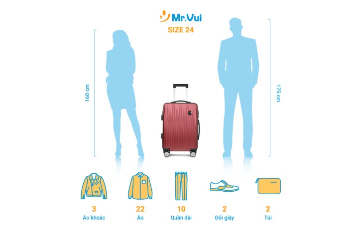 Vali 24 inch có kích thước tiêu chuẩn 60 x 43 x 28 cm, với trọng lượng chứa đồ tối đa khoảng 25kg. Đây là lựa chọn lý tưởng cho:
