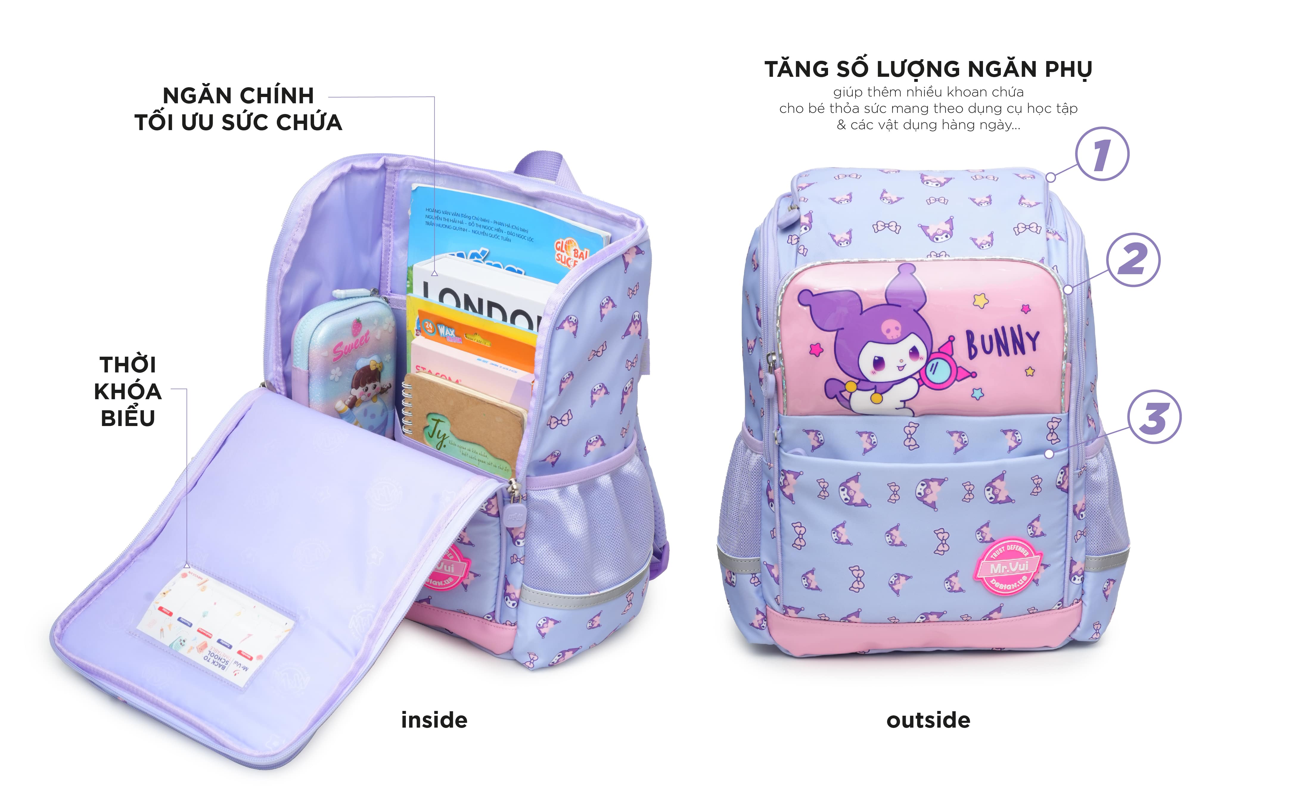 - Ngăn chứa khoa học: gồm các ngăn lớn và ngăn phụ, giúp bé dễ dàng sắp xếp sách vở, hộp bút và bình nước một cách gọn gàng. Mr.Vui