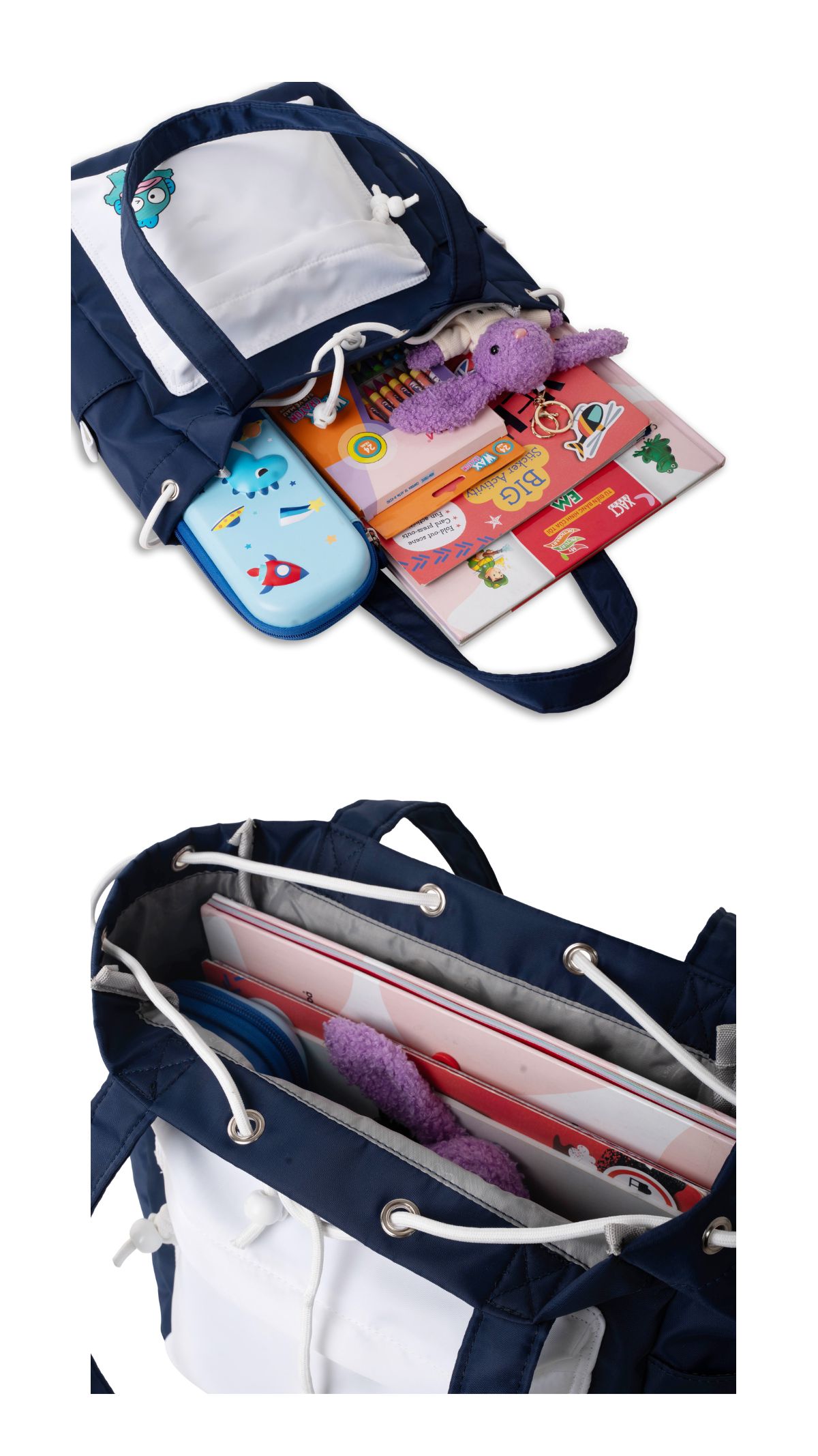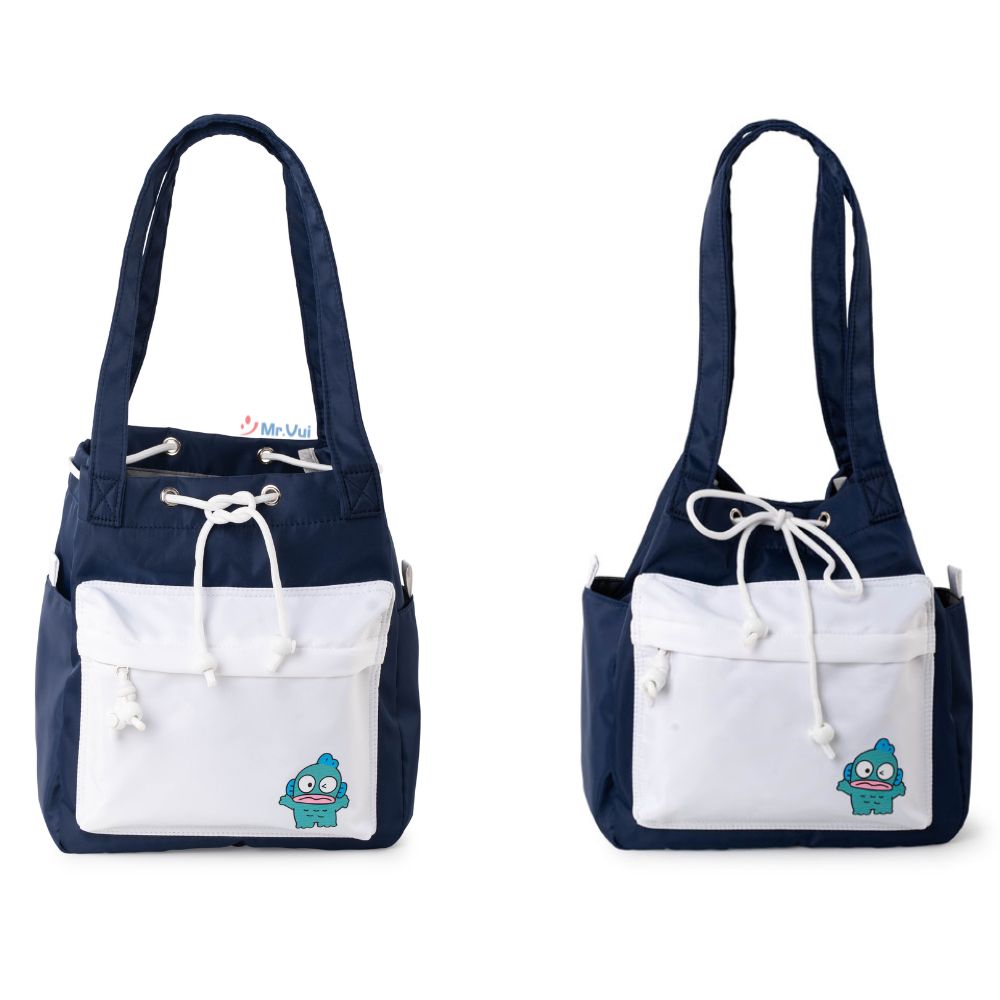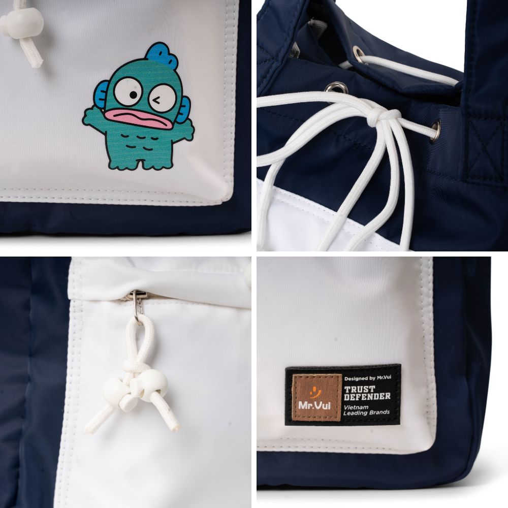 Điểm nhấn ở mặt trước là túi phụ màu trắng nổi bật, đính kèm họa tiết nhân vật hoạt hình trẻ trung - tăng thêm nét đáng yêu, phù hợp với giới trẻ nhưng vẫn không kém phần thanh lịch.