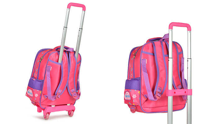Balo được thiết kế gồm ngăn chính rộng rãi và nhiều ngăn phụ giúp bé thoải mái đựng đồ dùng học tập; quần áo khi đến trường hoặc du lịch cùng gia đình. Sản phẩm có đáy balo là khung nhựa và bánh xe chắc chắn gắn kết cần kéo giúp bé dễ dàng di chuyển.. Đáy nhựa - cần kéo dễ dàng tháo rời khỏi sản phẩm; trở thành balo bình thường, bé dễ dàng mang lên vai bằng 2 quai đeo phía sau. Bên hông được trang bị 2 túi lưới đựng bình nước tiện lợi.